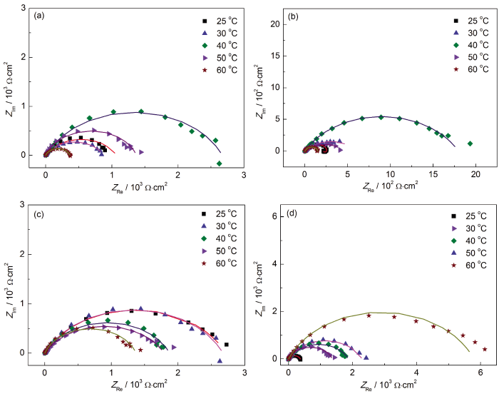 20#碳钢在不同温度下含有不同浓度十六烷基咪唑啉的3.5%NaCl溶液中的阻抗谱