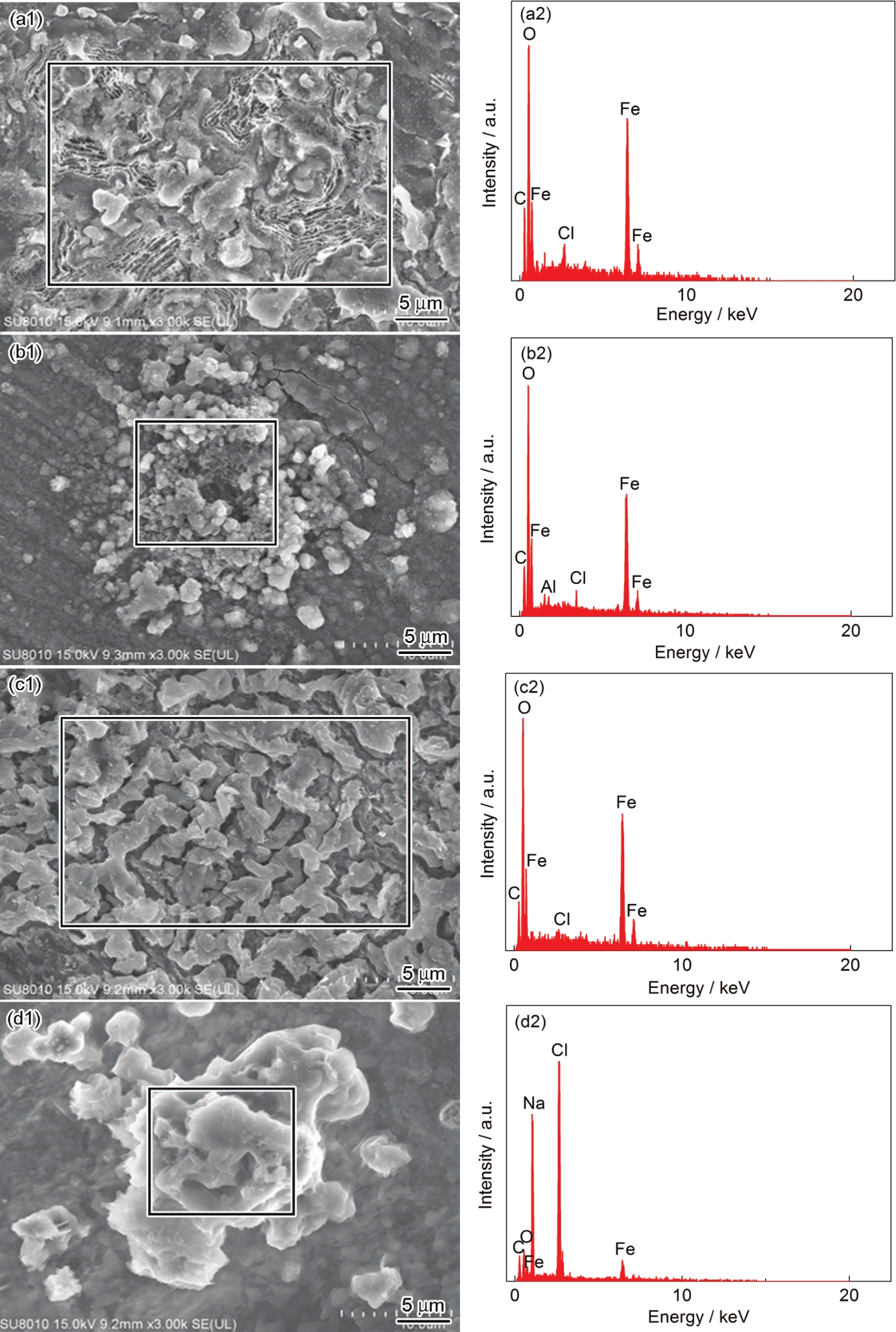 | Fig.6 SEM images (a1~d1) and EDS results (a2~d2) of X70 steel after 168 h corrosion in 3.5%NaCl solution under various hydrostatic pressures of 0 MPa (a), 1 MPa (b), 2 MPa (c) and 3 MPa (d) |