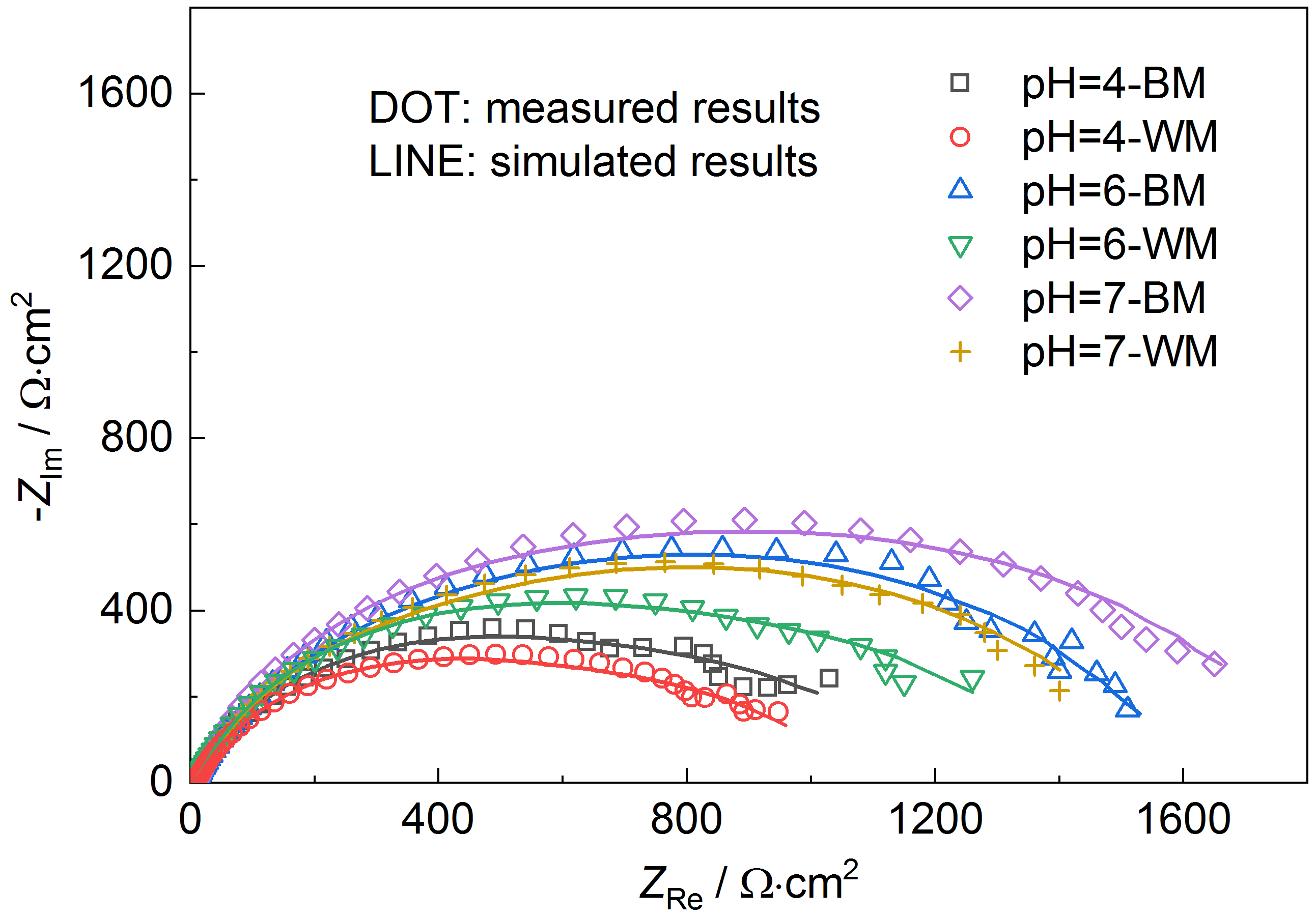 | Fig.6 Nyquist plot of BM and WM in different pH values |
