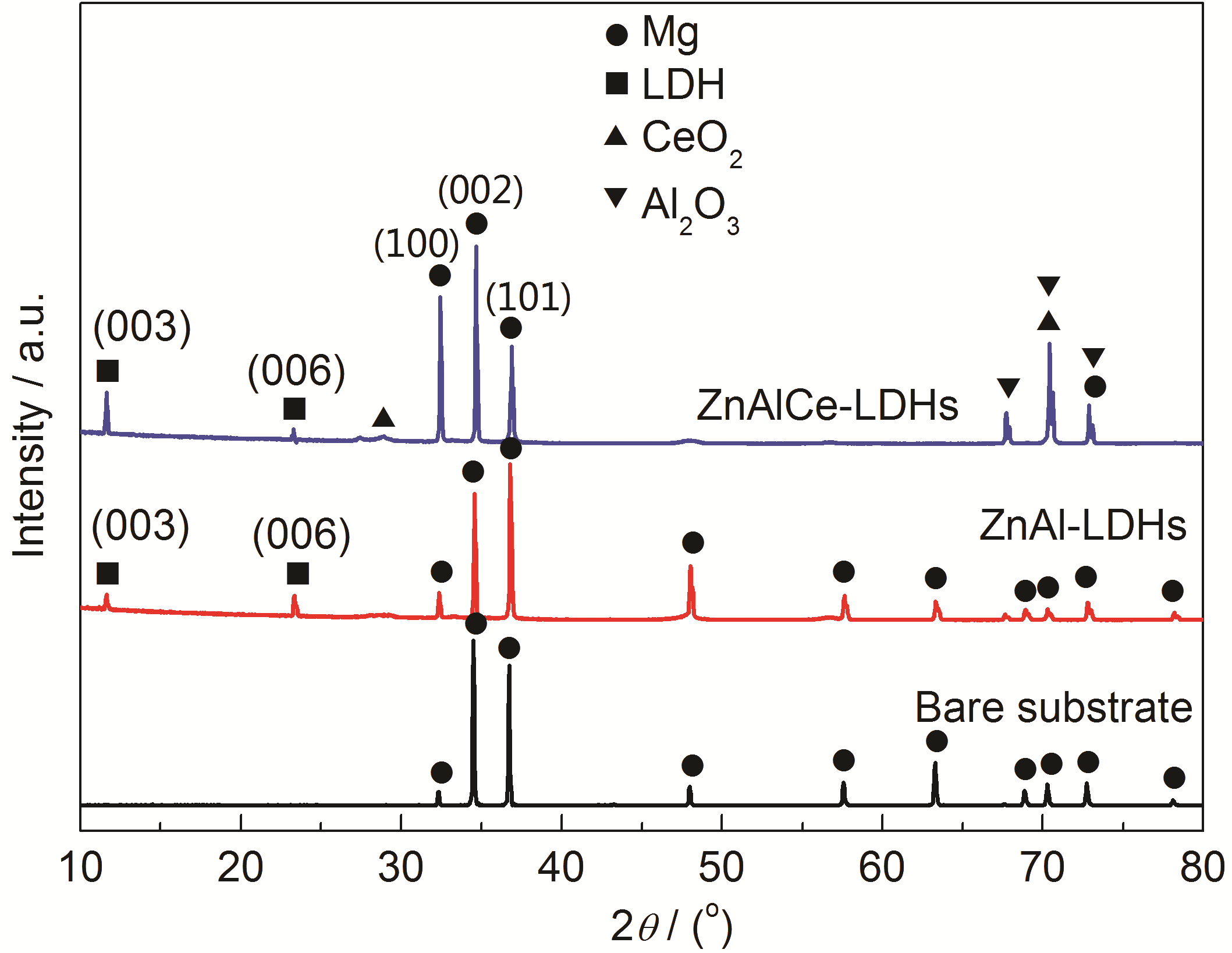 | Fig.1 XRD patterns of AZ91D samples without and with ZnAl-LDHs and ZnAlCe-LDHs films |