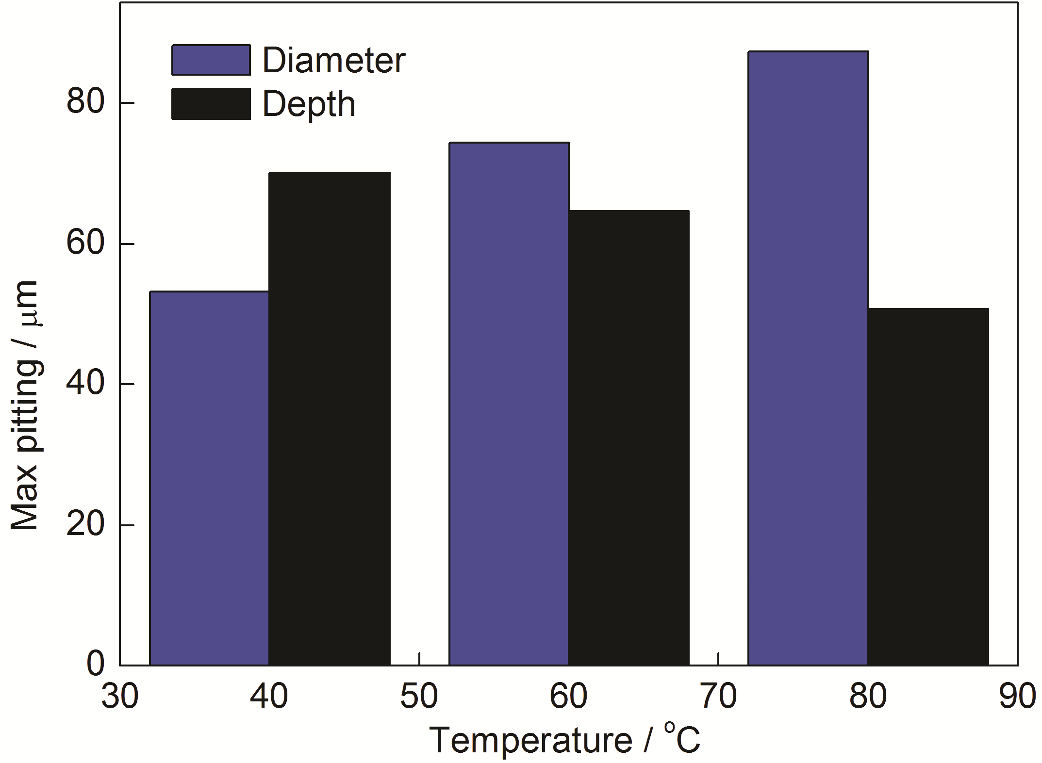 | 图6 14Cr12Ni3WMoV不锈钢在不同温度下0.02 mol/L NaCl溶液中最大点蚀坑的深度和孔径 |