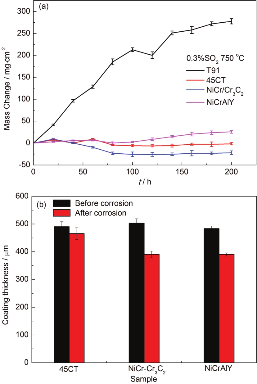 | Fig.1 Corrosion kinetic curves of sample (a) and bar graph of coating thickness change before and after corrosion (b) |