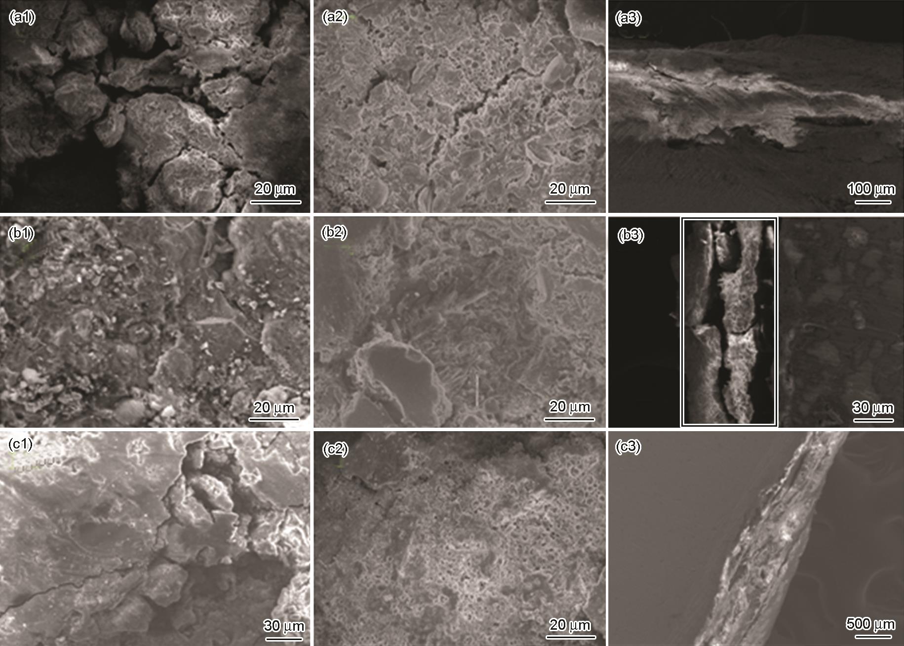 | Fig.4 SEM photographs of the front (a1~c1) and back (a2~c2) sides and cross section (a3~c3) of cold galvanized (a) , zinc rich (b) and hot-dip galvanized (c) panels after exposure test |