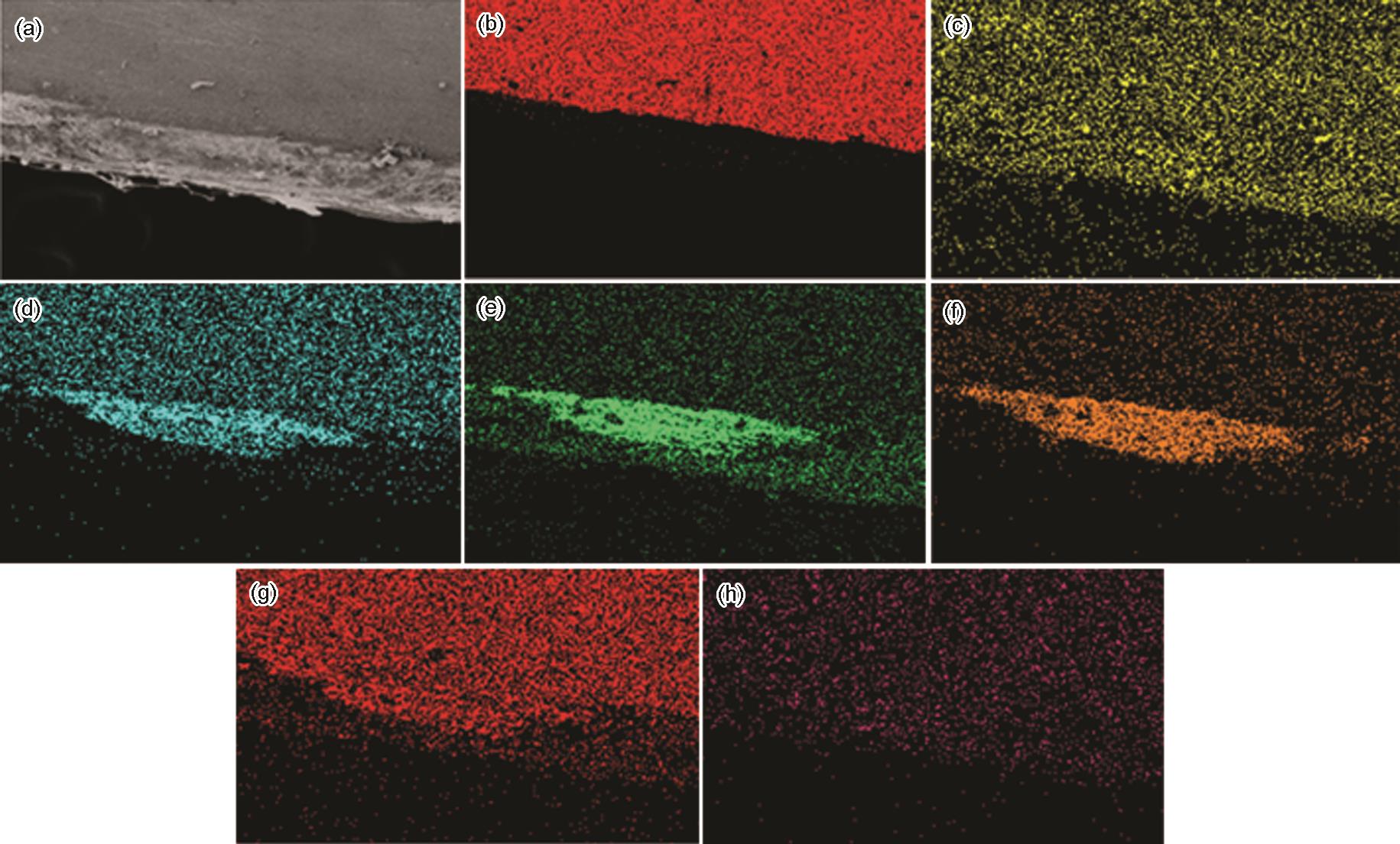 | Fig.6 SEM image (a) and EDS elemental mappings of Fe (b), O (c), Ca (d), Zn (e), Cl (f), Na (g) and element contents (h) of the cross section of the corrosion product layer formed on cold galvanized plate after exposure test |