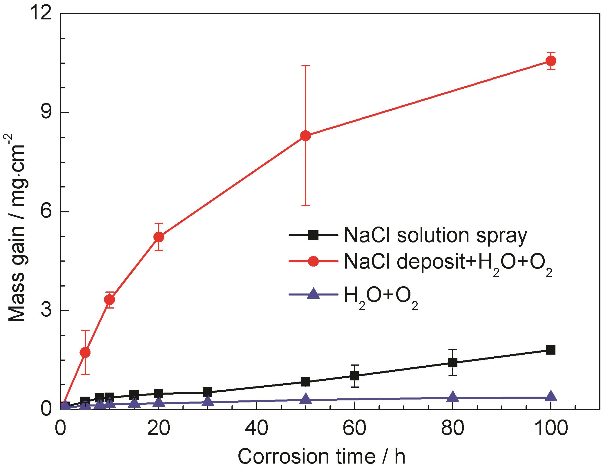 | Fig.2 Mass gains of Ti60 alloy during exposure in H2O+O2, NaCl solution spray and solid NaCl+H2O+O2 deposit environments at 600 ℃[ |