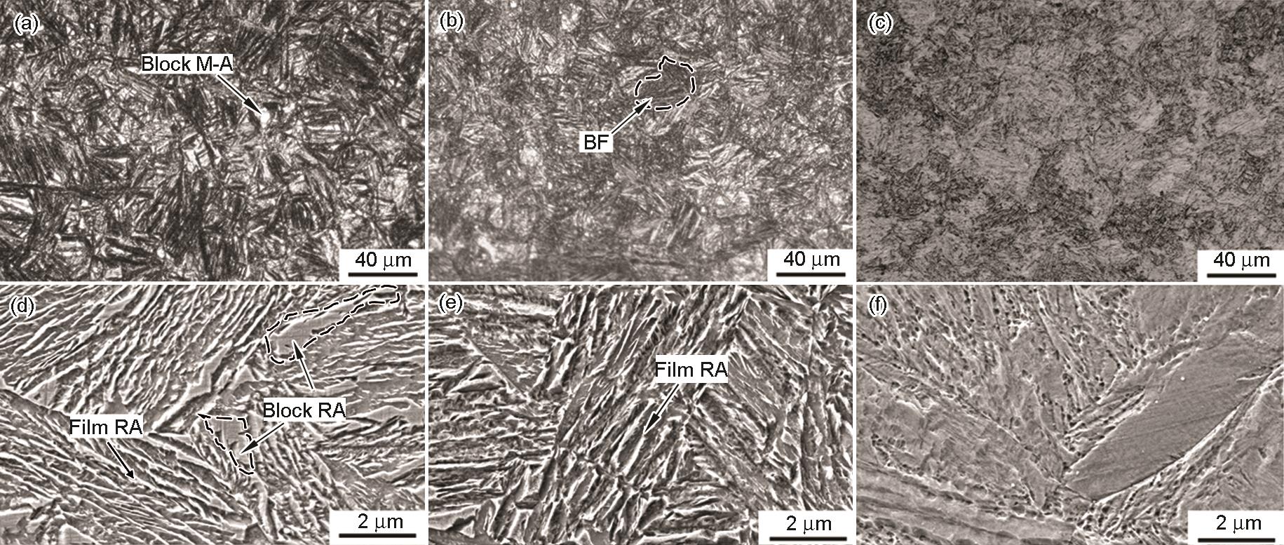 | Fig.1 OM images (a~c) and SEM images (d~f) for one-step bainite steel (a, d), two-step bainite steel (b, e), and martensitic steel (c, f) |