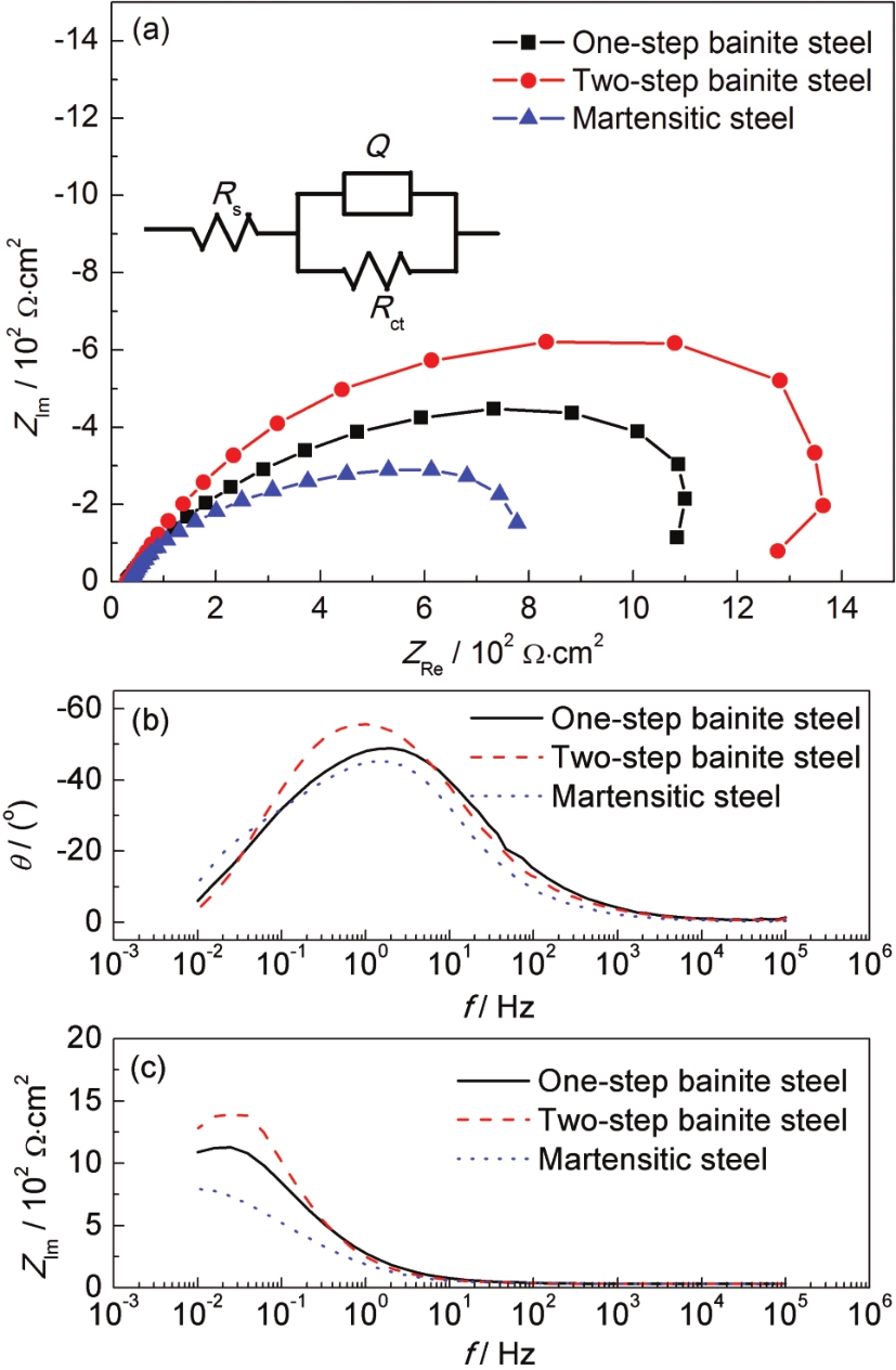 | Fig.5 Nyquist (a) and Bode (b, c) plots curves of the experimental steels |