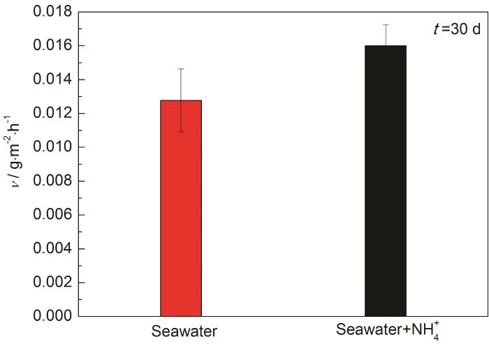 实验海水取自山东青岛沙子口海域,控制腐蚀介质温度为 (25±0.2) ℃,初始pH (7.9±0.1)。向天然海水中加入分析纯NH4Cl得到加NH4+海水,其中NH4+浓度为10 mg/L。失重测试测试周期为30 d,设置3组平行样。除锈处理参照GB/T 16545-2015。