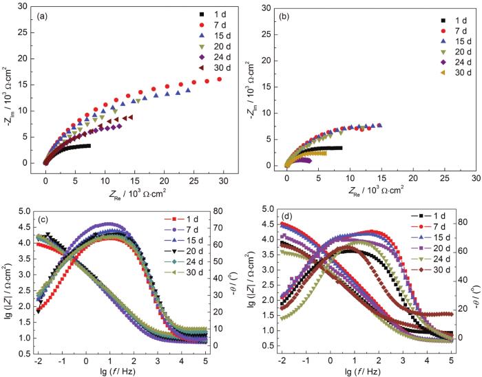 Nuquist (a, b) and Bode (c, d) plots of B10 Cu-Ni alloy at natural seawater (a, c) and seawater with NH+4 (b, d)