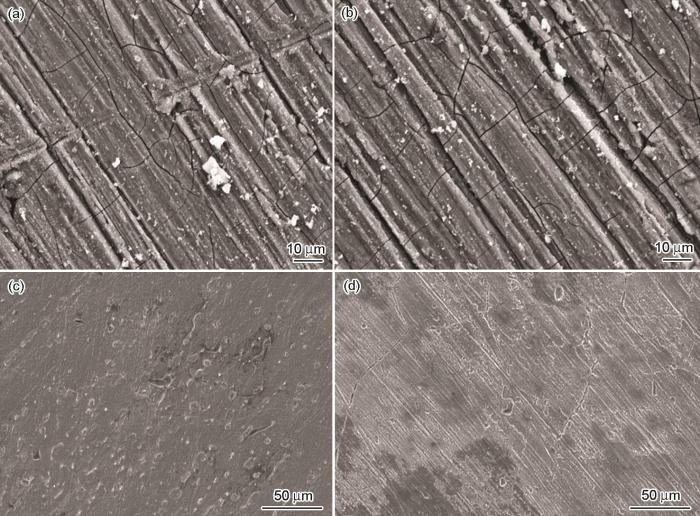 SEM images of corrosion product (a, b) and derusted substrate surface (c, d) of B10 Cu-Ni alloy immersed in the corrosive medium at natural seawater (a, c) and seawater with NH4+ (b, d) for 30 d