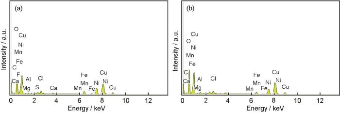 EDS results of corrosion products of B10 Cu-Ni alloy immersed in natural seawater (a) and seawater with NH4+ (b) for 30 d