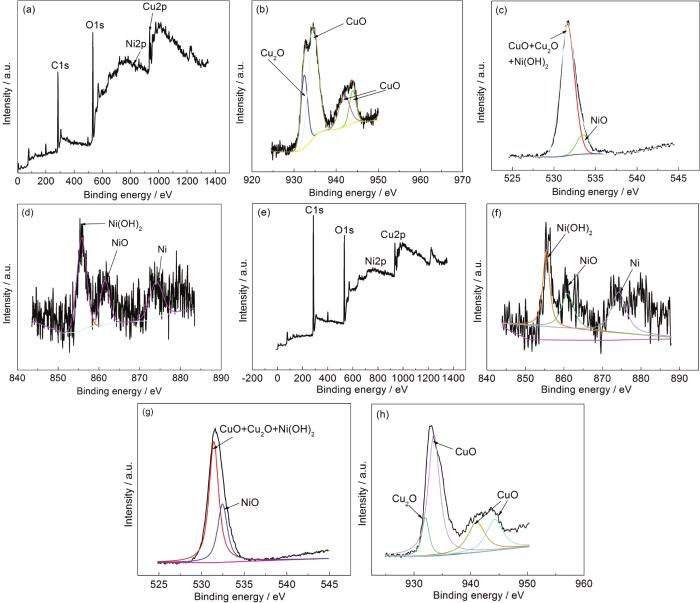 XPS spectrograms of the corrosion product of B10 Cu-Ni alloy immersed in natural seawater (a~d) and seawater with NH4+ (e~h) for 30 d: (a, e) all sprctrum, (b, f) Cu2p, (c, g) O1s, (d, h) Ni2p