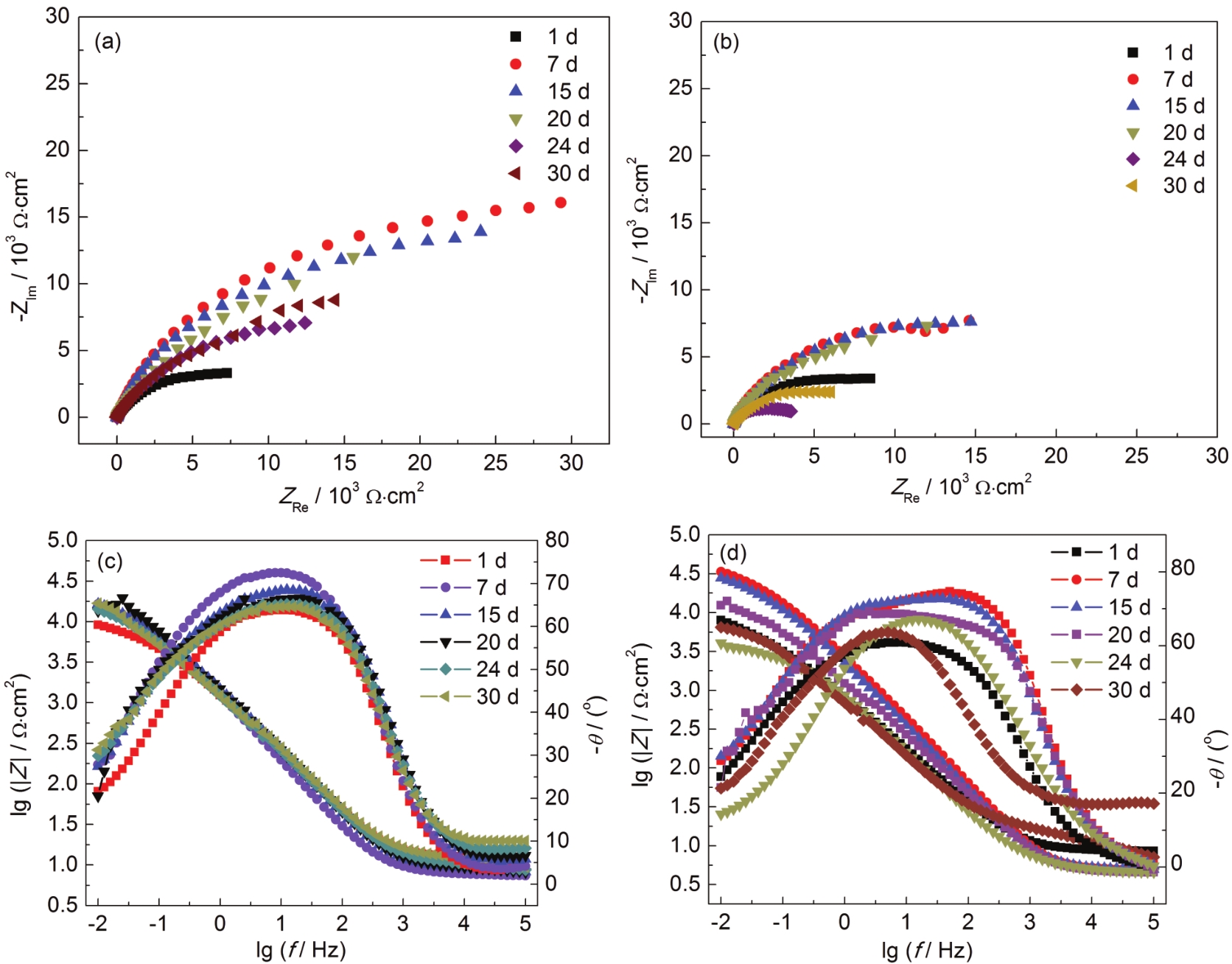 | Fig.3 Nuquist (a, b) and Bode (c, d) plots of B10 Cu-Ni alloy at natural seawater (a, c) and seawater with NH+4 (b, d) |
