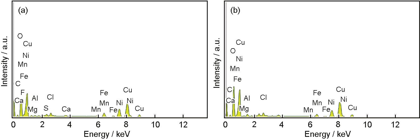 | Fig.7 EDS results of corrosion products of B10 Cu-Ni alloy immersed in natural seawater (a) and seawater with NH4+ (b) for 30 d |