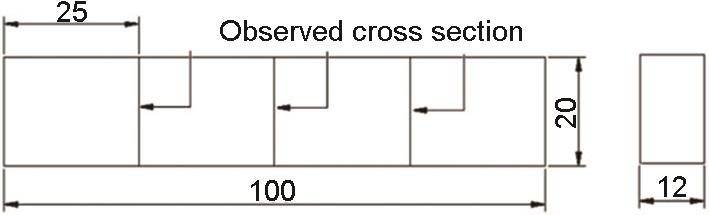 | 图2 试样尺寸 (mm) 及观察截面示意图 |