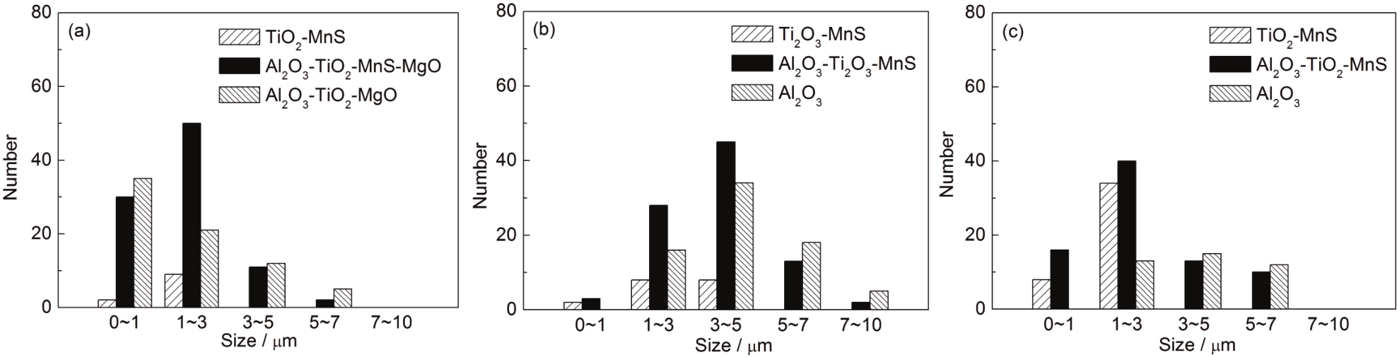 | Fig.5 Statistics of type, quantity and size of inclusions in 1# sample (a), 2# sample (b), 3# (c) sample steel |