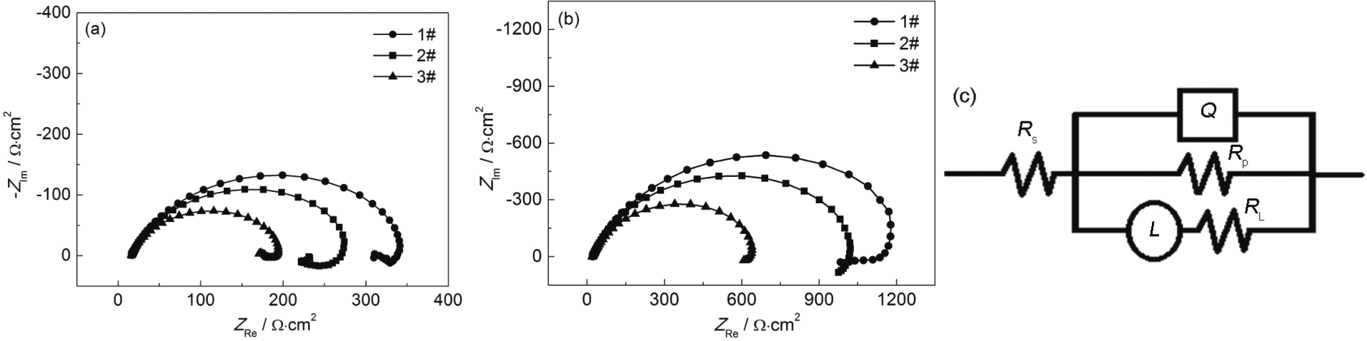 | Fig.7 Nyquist curves of three kinds of steel in NACE A solution (a), 3.5%NaCl solution (b) and fitting circuit diagram of Nyquist curves (c) |