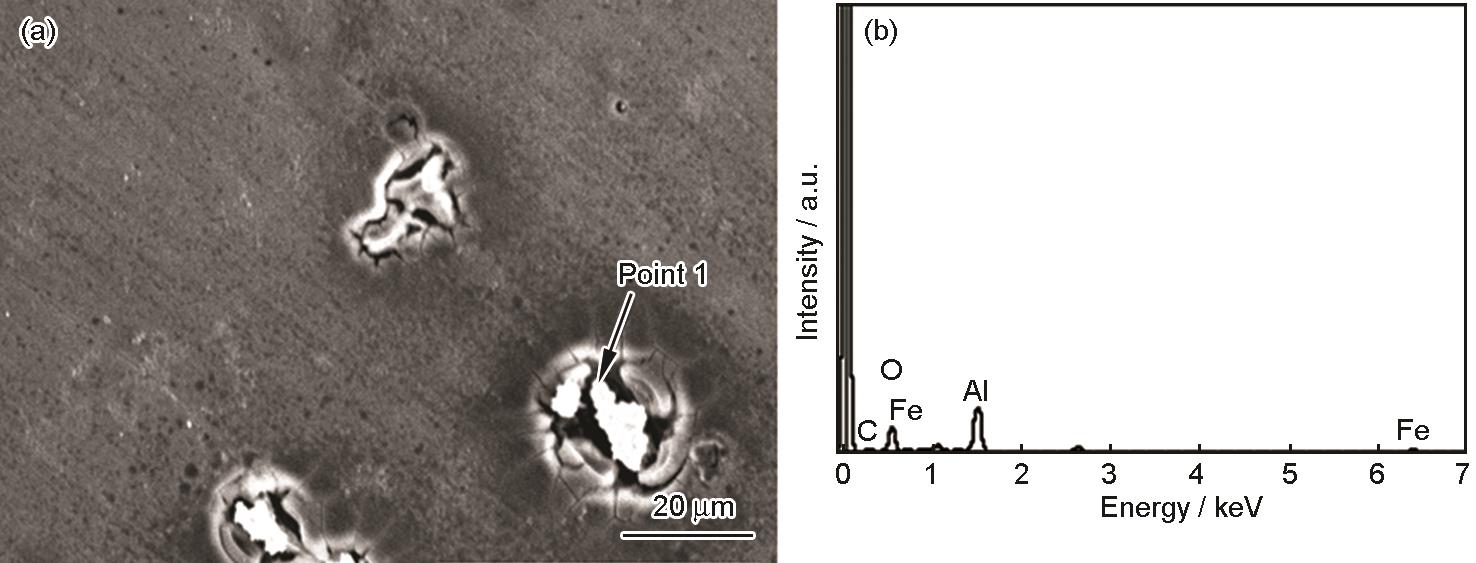 | 图3 Al-3.0Mg合金在无磁场环境下3.5%NaCl溶液中浸泡48 h后点蚀坑形貌及EDS分析 |