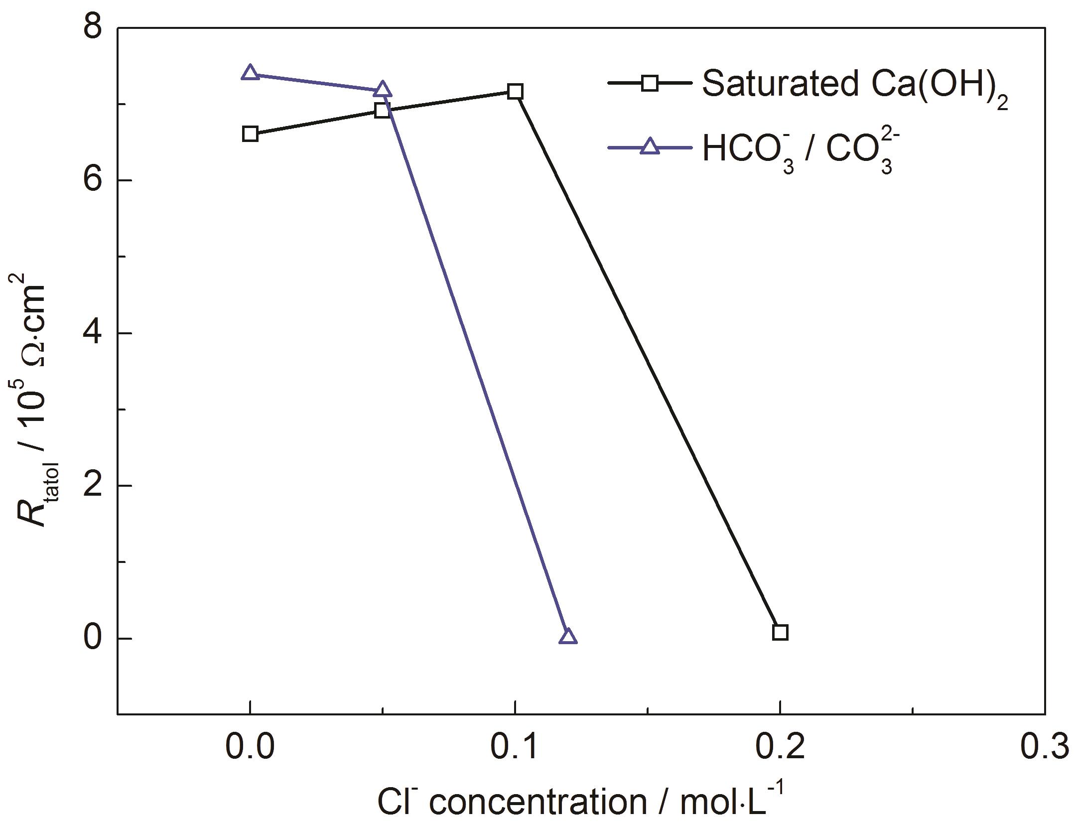 图5 在不同模拟混凝土孔隙液中304不锈钢的Rtotal值随Cl-浓度的变化曲线 |