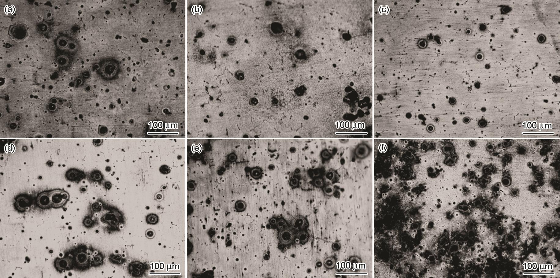 | Fig.2 Surface morphologies of 5052 Al-alloys with different Er addition after immersion test: (a) A1; (b) A2; (c) A3; (d) A4; (e) A5; (f) A6 |