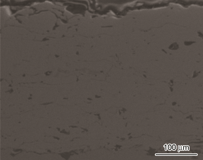 采用等离子喷涂技术制备了FeCrMoCBY铁基非晶涂层,研究了铁基非晶涂层在3.5%NaCl溶液中浸泡不同时长后的电化学腐蚀性能和微观组织结构。结果表明,在720 h的浸泡期间,涂层的耐蚀性经历了先提高后降低的变化,在浸泡216 h时达到最优,腐蚀电流密度达到最低,为3.393×10-5 A·cm-2,且此时涂层的表面更加致密,没有明显孔隙。在经过720 h浸泡后,涂层仍能保持在一个相对较低的腐蚀电流密度6.970×10-5 A·cm-2。