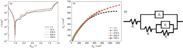 Tafel polarization curves (a) and EIS patterns (b) of coatings under different immersion periods impedance spectrum fitting circuit model (c)
