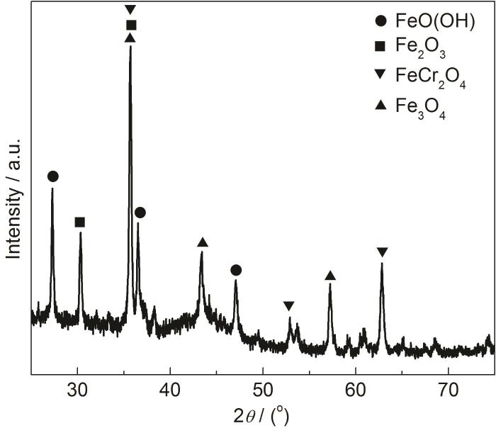 图4为经过720 h浸泡后的涂层的腐蚀产物的XRD图谱,可见浸泡后的喷涂态涂层的腐蚀产物由FeOOH、Fe2O3、FeCr2O4、Fe3O4构成,腐蚀产物中含有铬的氧化物,结合前述电化学分析,推测可能是涂层在浸泡腐蚀初期Fe和Cr会同时参与腐蚀反应,由于Fe的腐蚀产物都呈现疏松的形态,难以抑制腐蚀的进行,因此浸泡前期涂层的电化学耐蚀性能较差,而经过较长时间浸泡后涂层中生成了Fe-Cr混合腐蚀产物,Cr具有显著的钝化特性,能生成钝化膜,能够延缓腐蚀的继续进行,但后期,在腐蚀介质的长期作用下,Cr的钝化膜遭到破坏,因而涂层的耐蚀性有所下降。