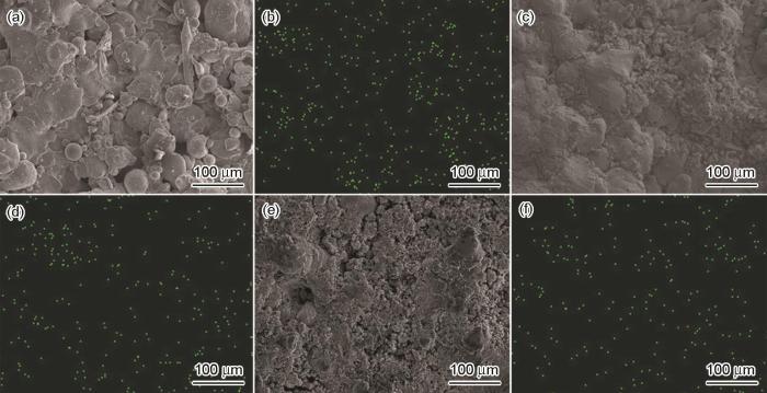 Micromorphologies of the unsoaked coating (a), 216 h (c) and 720 h (e) immersed coating, and Cr element distribution diagram of the unsoaked (b), 216 (d) and 720 h (f) immersed coating