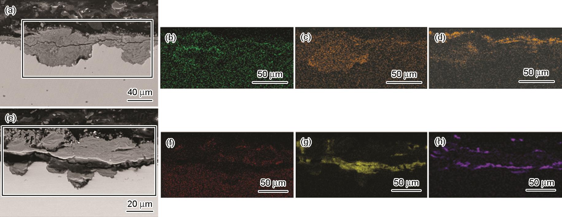 Fig.6 Cross-section SEM images of 15%P (a~d) and 2%P (e~h) steels and EDS elemental mappings of Cr (b, f), S (c, g) and Cu (d, h) corrosion morphology |