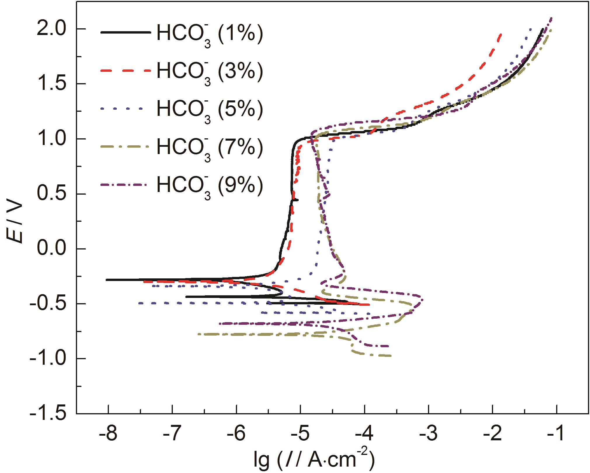 Fig.1 Polarization curves of X90 pipeline steel with differ-ent concentrations of HCO3- |
