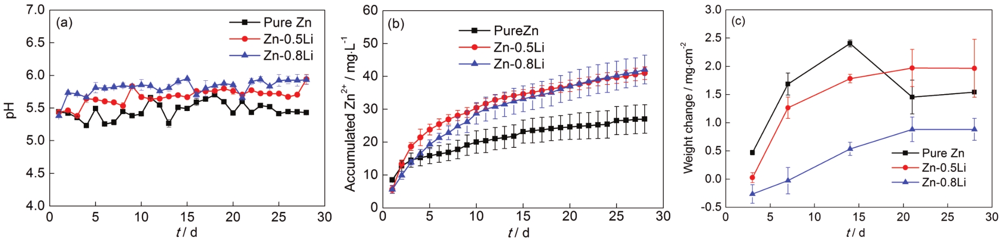 图6 纯Zn、Zn-0.5Li和Zn-0.8Li合金在AU浸泡中的pH值、Zn2+释放量以及合金结壳性随浸泡时间变化的趋势线 |
