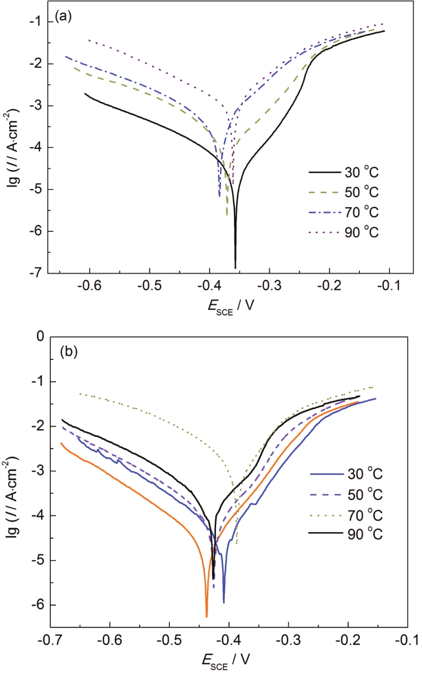 | Fig.5 Polarization curves of N80 steel in 0.5 mol·L-1 HCl solutions containing B-S (a) and BB-S (b) inhibitors at different temperatures |