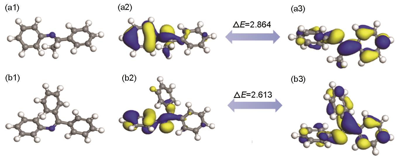 | Fig.8 Frontier orbital energy level diagrams of B-S (a) and BB-S (b) inhibitors: (a1, b1) optimized molecular structure of corrosion inhibitor, (a2, b2) HOMO distribution of corrosion inhibitor, (a3, b3) LUMO distribution of corrosion inhibitor |
