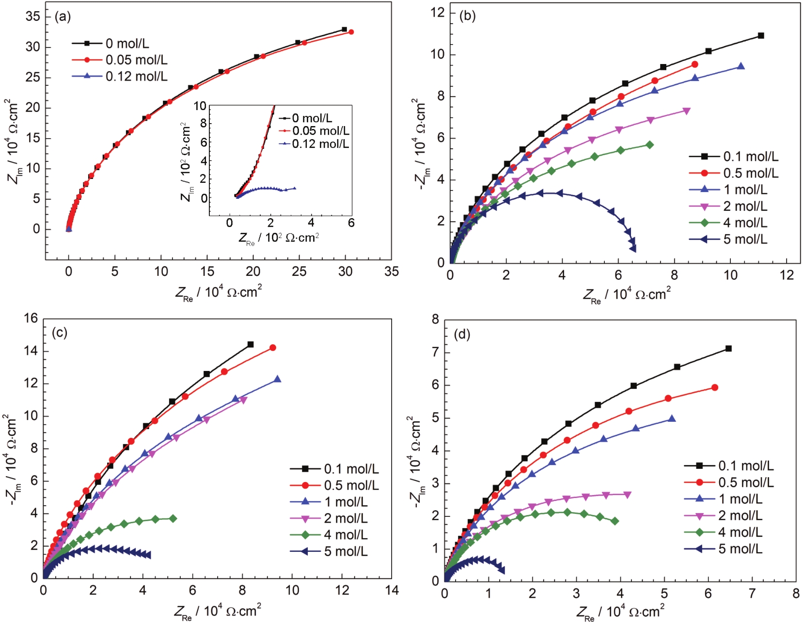 Fig.3 EIS results of 304 stainless steel after passivation in nitric acid for 0 h (a), 0.5 h (b), 2 h (c), 24 h (d) and then polarization at a constant potential of 550 mV |