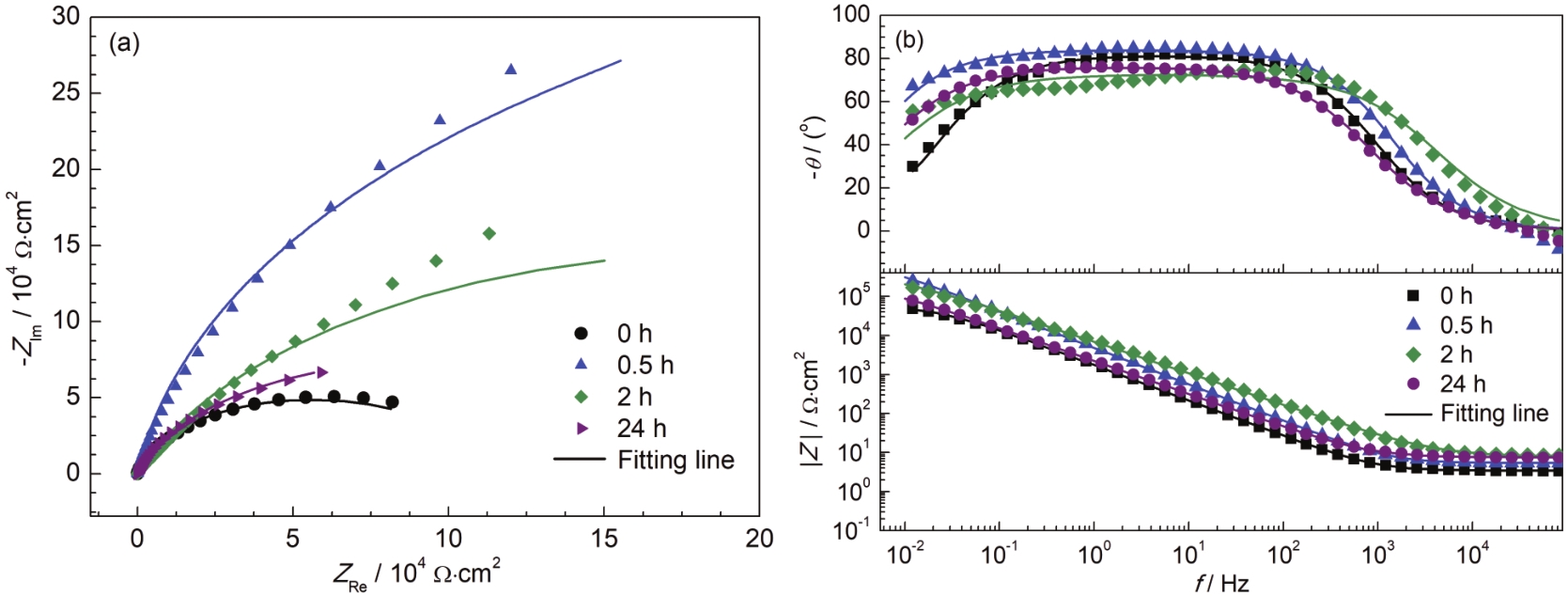 Fig.4 Nyquist (a) and Bode (b) plots of 304 stainless steel after passivation for different time in 0.5 mol/L NaCl solution |