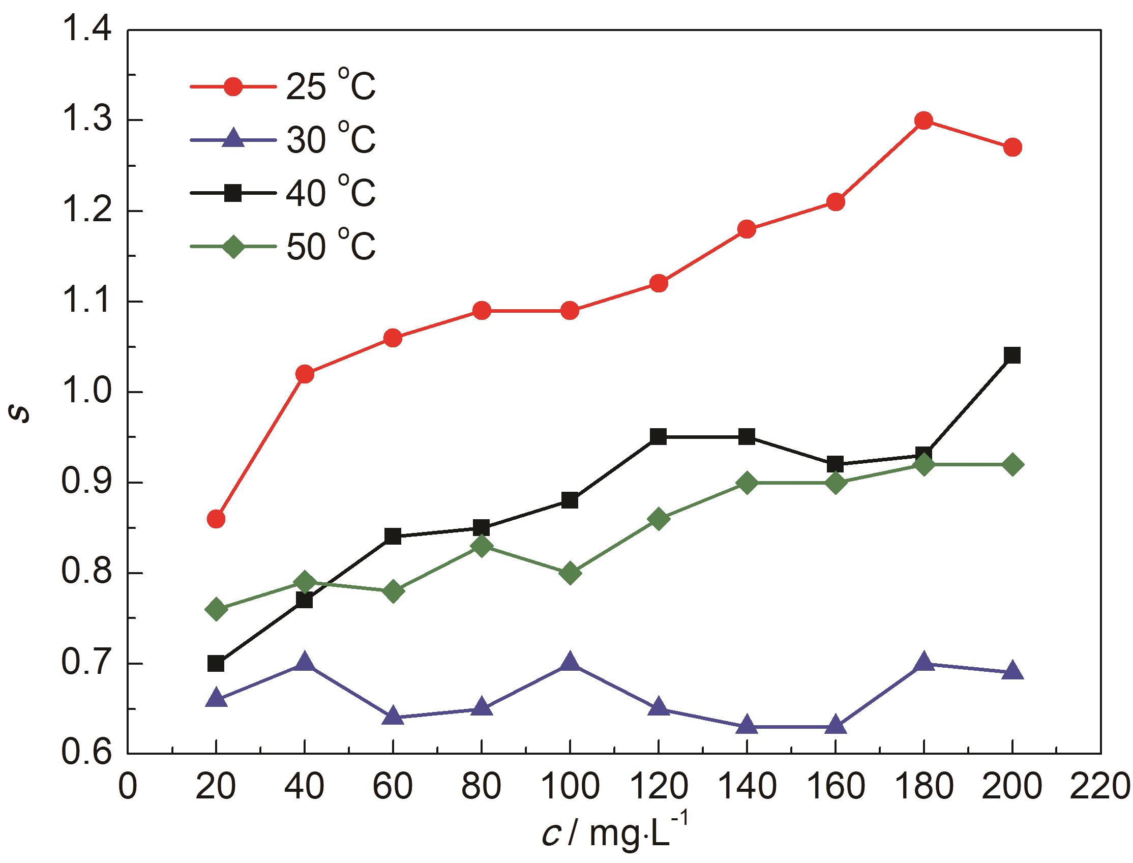 Fig.2 Synergism parameter (s) values of different WGHE concentrations (c) with 100 mg/L KI in 1.0 mol/L H3C6H5O7 solution at 25~50 ℃ |
