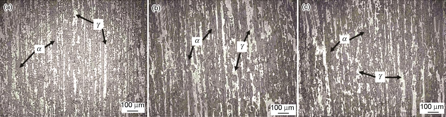 Fig.1 Metallographic observation of 1# (a), 2# (b) and 3# (c) 2002 duplex stainless steel samples |