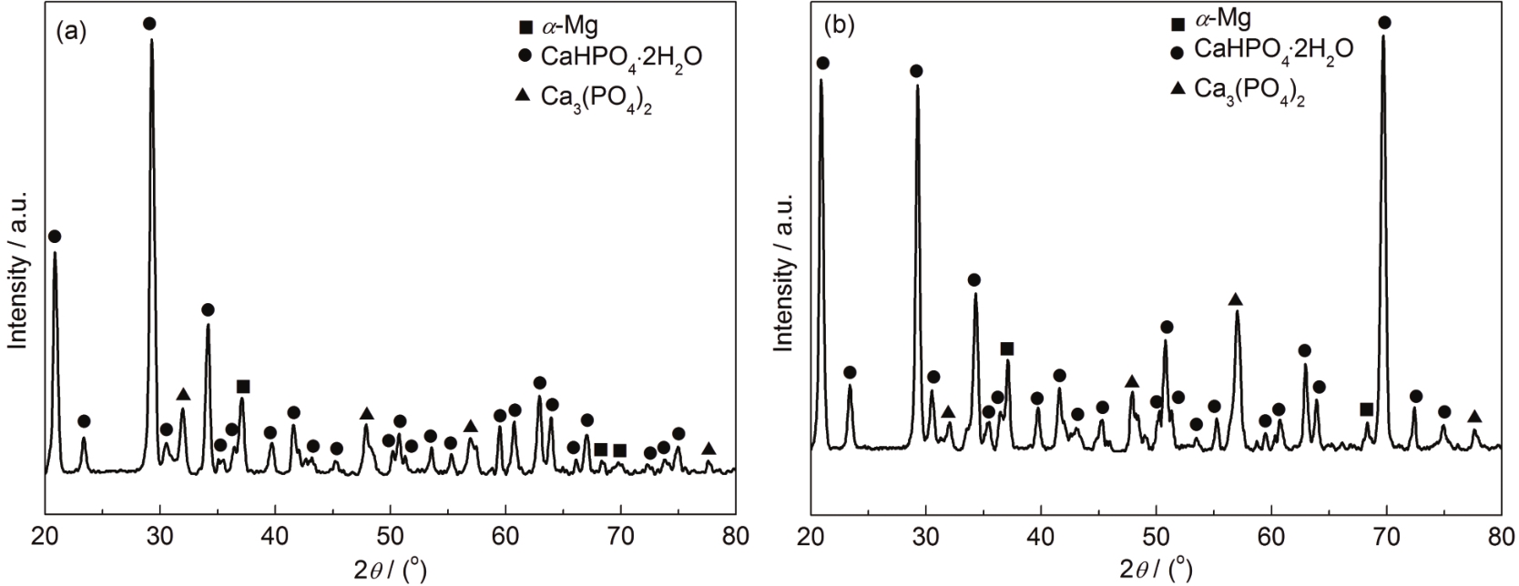 Fig.4 XRD pattern of calcium phosphating film without (a) and with (b) rare earth treated |