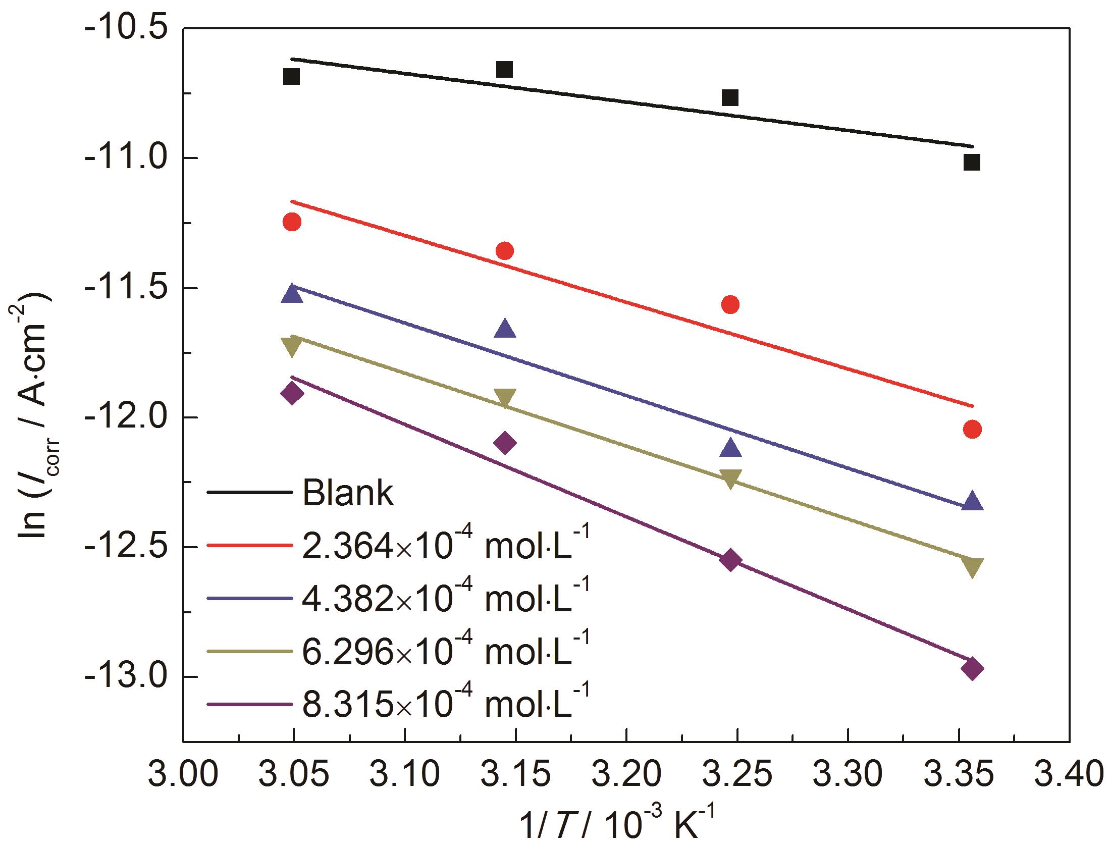 图8 Q235钢在含不同浓度SDBS的SPC溶液中的Arrhen-ius拟合曲线 |
