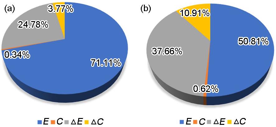 图4 铸态及LSM MAB的腐蚀-空蚀交互作用各分量占空蚀总失重的比例 |