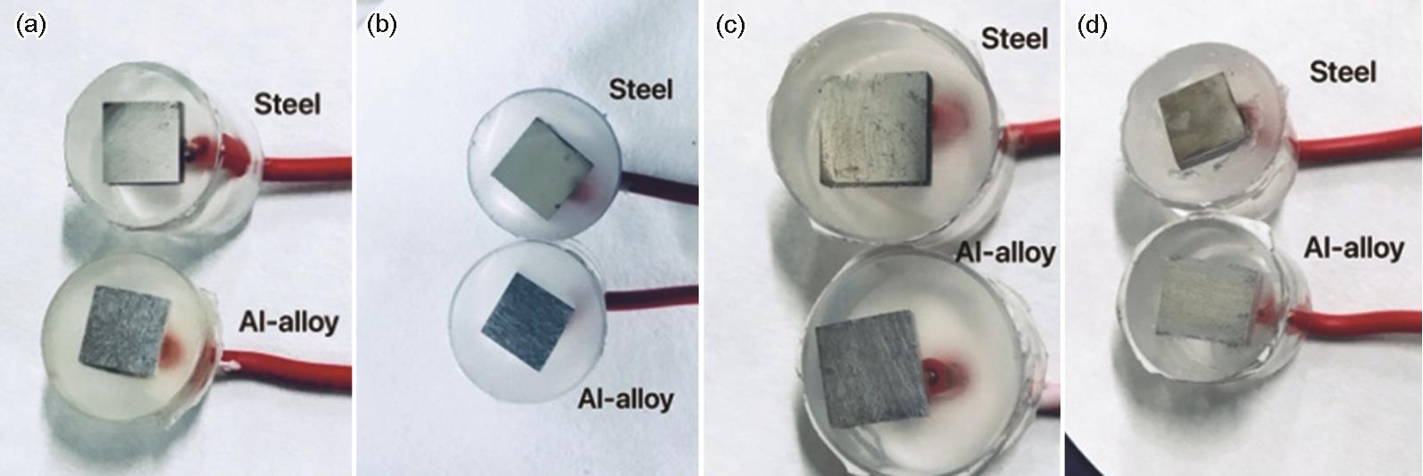 Fig.1 Macroscopic morphologies of the couple of 5083 Al-alloy and 30CrMnSiA steel after 1 d immersion in NaCl solutions with the Cl- concentrations of 0.05 mol/L (a), 0.1 mol/L (b), 0.6 mol/L (c) and 0.85 mol/L (d) |