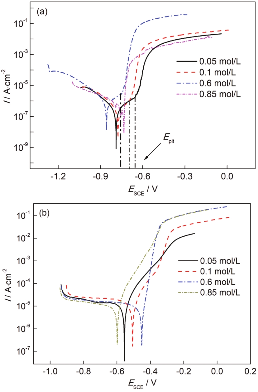 Fig.6 Potentiodynamic polarization cures of 5083Al-alloy (a) and 30CrMnSiA steel (b) in NaCl solutions with different concentrations |