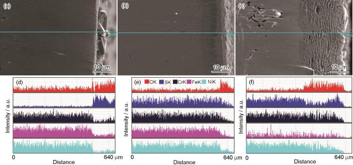 Cross-sectional back-scattering electron image along with EDS line-scan profiles of the corrosion layer on Incoloy800 alloy (a, d), Incoloy825 alloy (b, e) and Incoloy625 alloy (c, f) exposed to supercritical water with 5000 mg/L sulfide at 25 MPa, 520 ℃ for 80 h