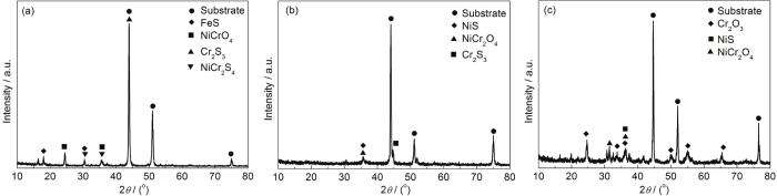 由图4可以得出,3种合金材料中,Incoloy800合金侧面形貌中未发现有明显的膜结构,说明其在含硫超临界水中的腐蚀程度微弱。在520 ℃条件下,只有最边缘处发生Fe、Ni、Cr含量下降,O、S含量上升,说明形成了单层膜,XRD检测结果 (图6a) 显示基体峰为最强峰,腐蚀产物主要为NiCrO4及少量的Cr2S3、NiCr2S4、FeS、FeSO4。其中NiCr2O4尖晶石相的结构致密,且Cr2S3与Cr2O3结构相似,说明Incoloy800合金在含硫超临界水环境中表现出良好的耐腐蚀特性。对于Incoloy825合金,520 ℃超临界条件下腐蚀膜厚约4.26 μm,通过线扫描元素分析可以看出O含量的增加量比S明显,其他金属元素含量均下降,与表面形貌分析结果一致,横截面膜结构比Incoloy800合金明显,说明腐蚀程度比其严重。另外,Incoloy825合金的腐蚀产物主要为NiS、Cr2S3、NiCr2O4 (图6b)。Inconel625合金在520 ℃超临界水中暴露80 h后,其横截面的腐蚀膜形貌呈现为条纹状,厚度达到19.72 μm。从线扫描元素分析可以看出,金属元素含量逐渐下降,尤其Ni最为明显,O含量一直呈上升趋势,S含量先减小后增大,可以得出Inconel625合金表面形成的是外层金属硫化物、内层金属氧化物的双层膜结构,其中外层膜约3.93 μm厚,而内层膜约15.79 μm厚。再结合图6c的XRD分析可得,Inconel625合金腐蚀膜外层主要成分为NiS,而内层为Cr2O3与NiCr2O4尖晶石相。这种产物组成与超临界水氧化环境中外层为NiO、内层为Cr2O3或尖晶石结构类似[8],不同之处在于此条件下的膜结构较厚,说明S比O更具有攻击性。
