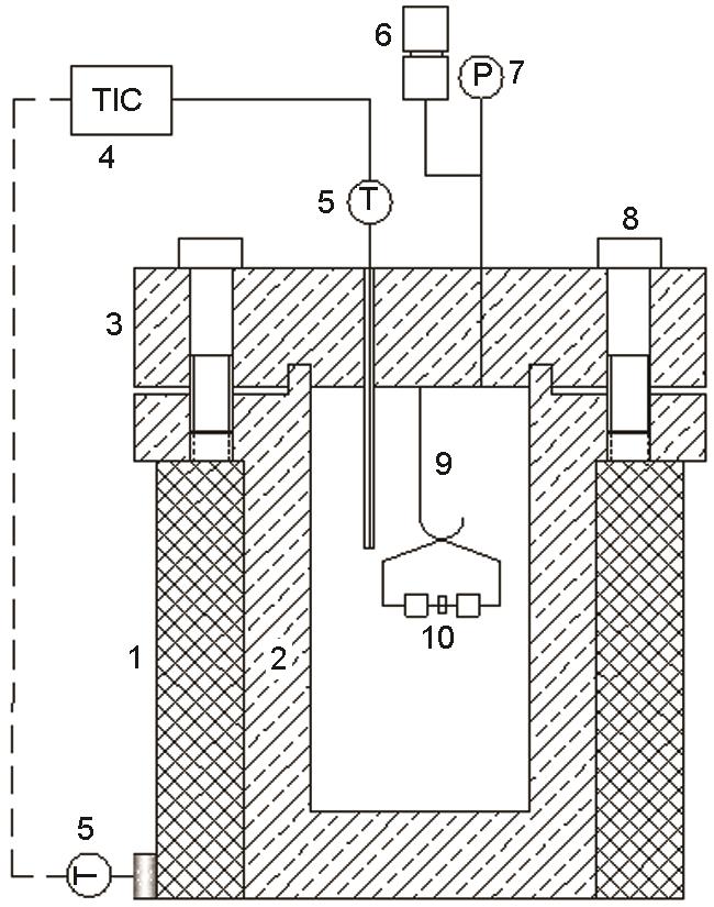 Fig.1 Schematic diagram of the batch supercritical water reactor (1 electrical heater; 2 reactor, 3 reactor cap, 4 temperature controller, 5 thermocouple, 6 safety valve, 7 pressure gauge, 8 bolt, 9 sample hook, 10 samples) |