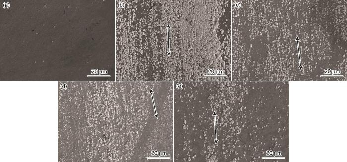 SEM images of surface under relative flow velocity of 0 m/s (a), 0.92 m/s (b), 1.27 m/s (c), 1.61 m/s (d), 2.01 m/s(e) after corrosion for 1000 h