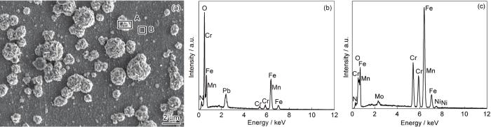 图6a点A处为试样在LBE中腐蚀1000 h后表面出现的球状化合物,主要元素为Fe和O,除此之外还有少部分Pb、Cr、N和Mn;点B处为腐蚀后的试样基体,主要元素为Fe、Cr、Mn。