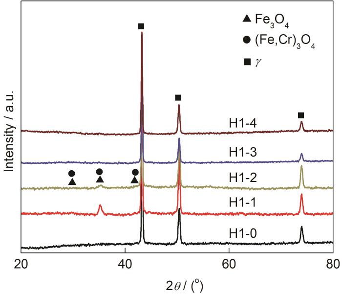 图7为不同相对流速下腐蚀试样表面XRD谱。XRD衍射峰的强度与物相的含量有一定关系,试样H1-1、H1-2表面氧化物含量较多,XRD图谱出现了Fe3O4和 (Fe,Cr)3O4衍射峰,而试样H1-0、H1-3、H1-4表面氧化物含量较少,仅检测出基体相。