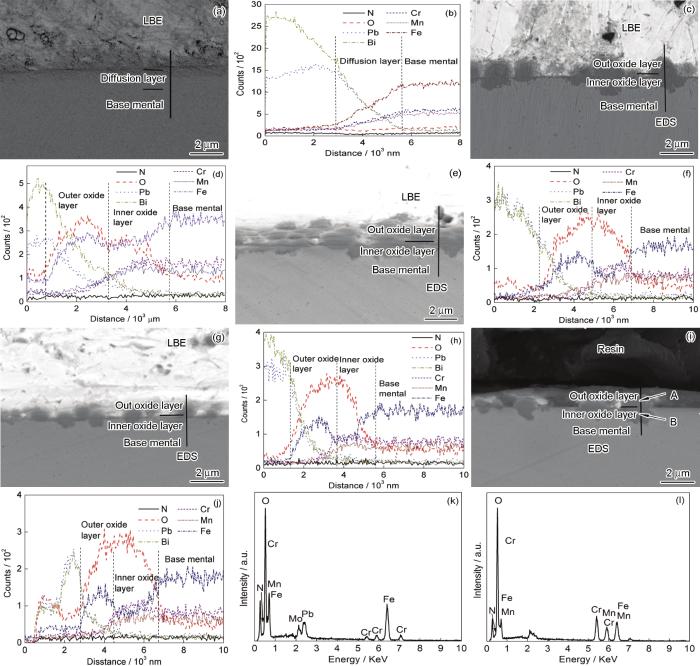 图8c、e、g、i中试样基体与铅铋合金交界处均出现颗粒状腐蚀物,且腐蚀产物颗粒一部分暴露在金属基体表面,一部分镶嵌在基体中,两部分相对于原始界面呈近似对称分布。图8d、f、h、j为试样界面腐蚀产物颗粒EDS线处元素扫描结果,根据元素含量的变化趋势可以看到,不同相对流速下试样界面处的腐蚀产物均具有明显的双层结构,双层结构以原始界面为分界线分为内外两层,外层富Fe、O,还有少量的Pb、Bi,内层由Fe、O、Cr、Mn组成。根据O、Pb、Bi、Fe、Cr等元素含量的变化,将试样H1-4截面腐蚀产物分为A、B两个区域,如图8i所示,并对每个区域进行EDS点分析,结果如图8k和l所示。通过EDS分析可见,形成于原始界面LBE一侧的外氧化层区域 (A区域),主要含有Fe和O;形成于原始界面基体一侧的内氧化层区域 (B区域),主要含有Fe、Cr、O,结合表面和XRD分析结果,可知外氧化层A区域Fe3O4,内氧化层中Cr含量略高于基体,而XRD图谱中并未出现Cr氧化物的衍射峰,据文献[13]可知,Cr是以合金元素的形式固溶在Fe3O4中形成Fe-Cr尖晶石晶体,故内氧化层B区域为尖晶石结构的 (Fe,Cr)3O4。随着相对流速的增大,内外氧化层中O、Cr含量不断增加,Fe含量不断降低,这是由于流速的增加导致界面处介质中合金元素浓度降低,化学势增大,传质效率提高,加速Cr、Fe向外扩散,O向内渗透,Cr在尖晶石中的扩散系数与Fe相比小三个数量级,因此Fe可以穿过尖晶石层与O反应,而Cr在尖晶石层富集[14]。另外根据内外层中Pb、Bi含量的变化,可以发现在外氧化层中含有一定量的Pb、Bi,这是由于外层Fe3O4疏松多孔,难以阻止Pb、Bi、O的渗透;而内氧化层是固溶形成的Fe-Cr尖晶石晶体,Cr原子半径比Fe原子小,固溶形成的Fe-Cr尖晶石点阵常数小于Fe3O4,能够更有效地阻止Pb、Bi的渗透,尤其是当相对流速增大时,传质过程加快,尖晶石中的Cr含量升高,对阻碍Pb、Bi元素渗透作用更加明显。