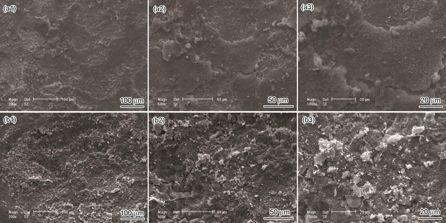 | Fig.8 SEM images of corrosion products on X65 steel after dynamic AC interference test under cathodic protection: (a1~a3) CP+100 A/m2 AC; (b1~b3) CP+300 A/m2 AC |